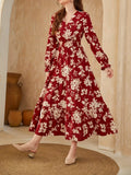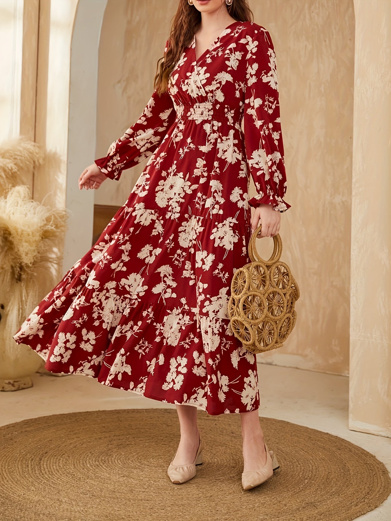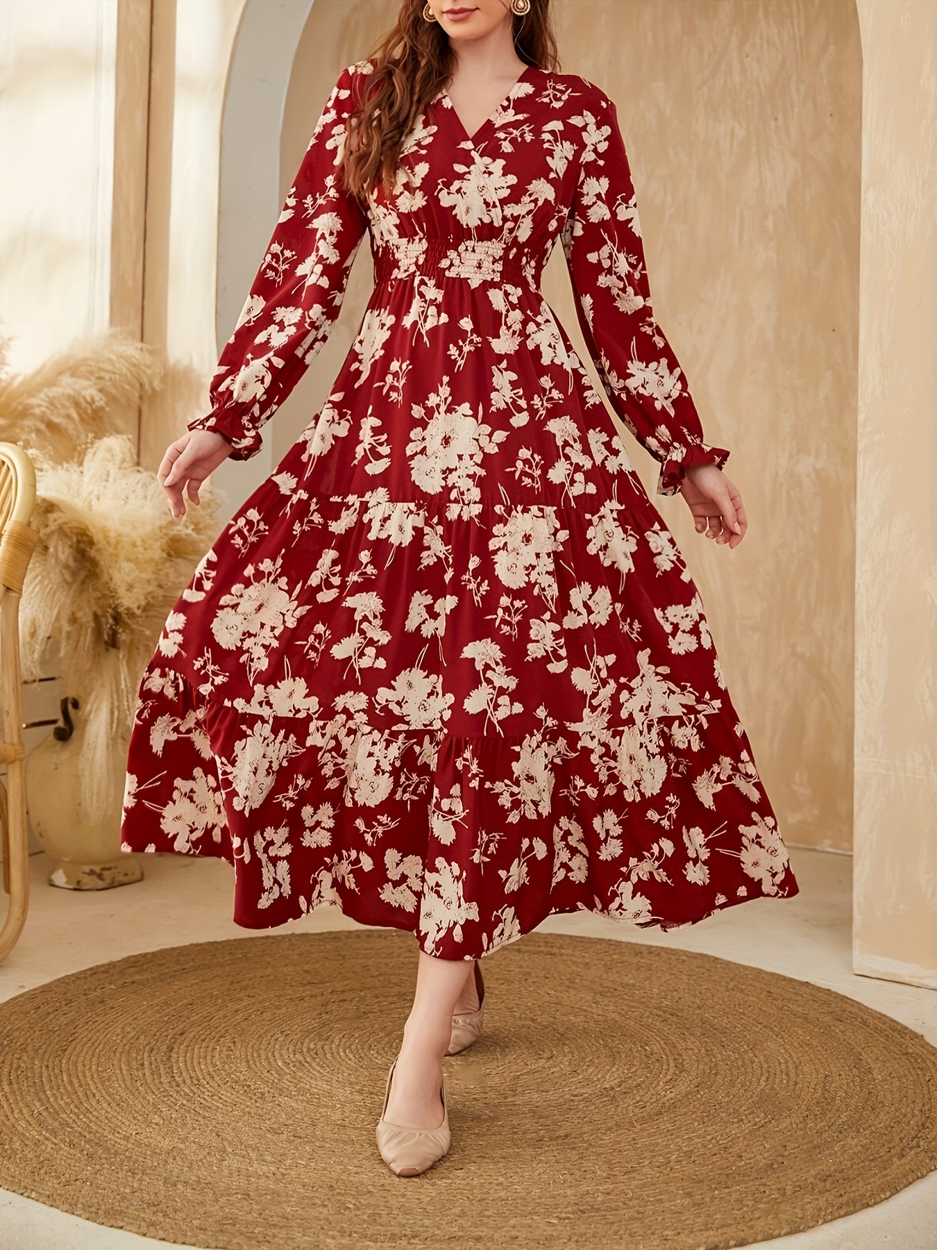Stunning Floral Ruffle A-Line Dress - Elegant Surplice Neck, Long Sleeve, Shirred Waist, Comfortable Fit for Fall - Women's Clothing for Everyday Wear